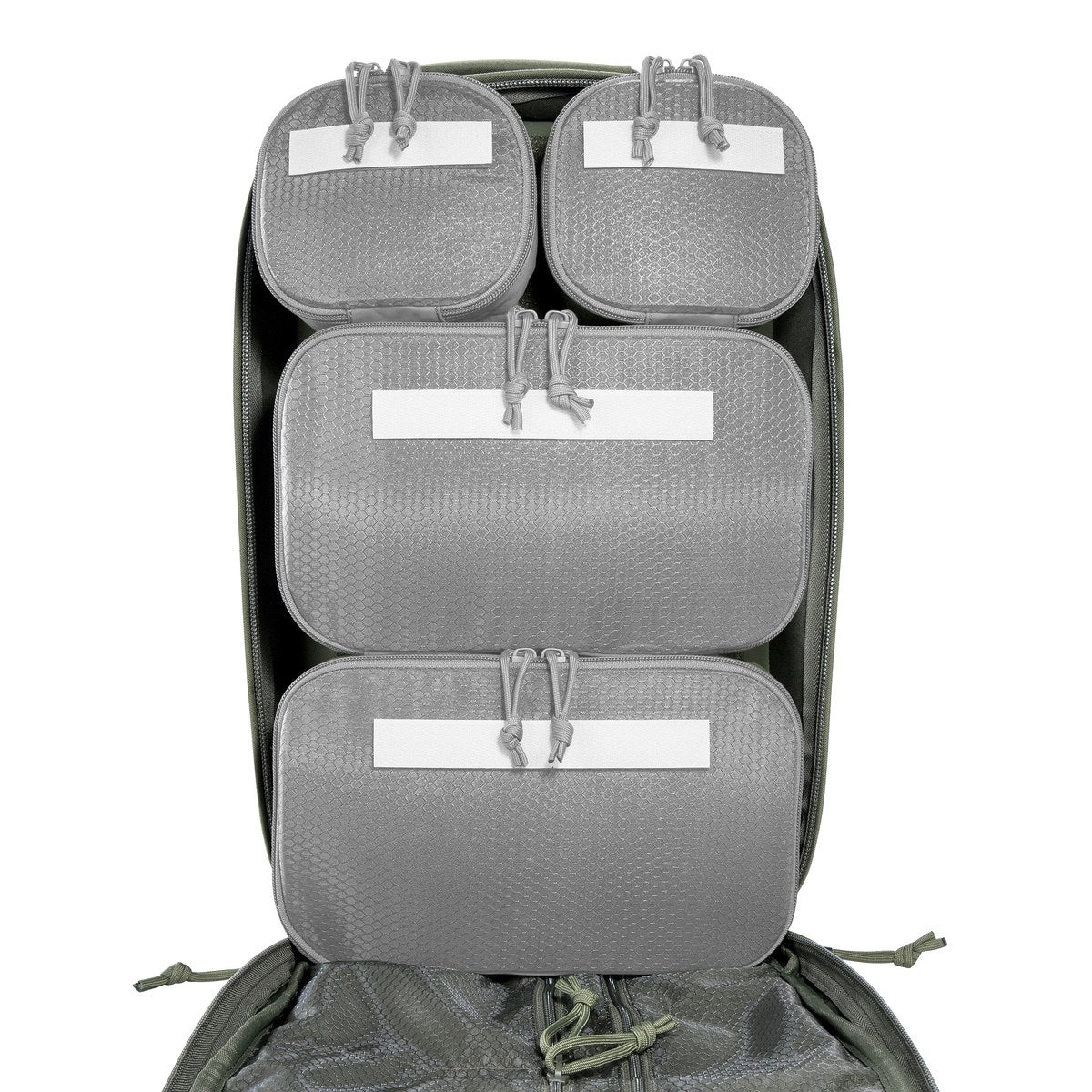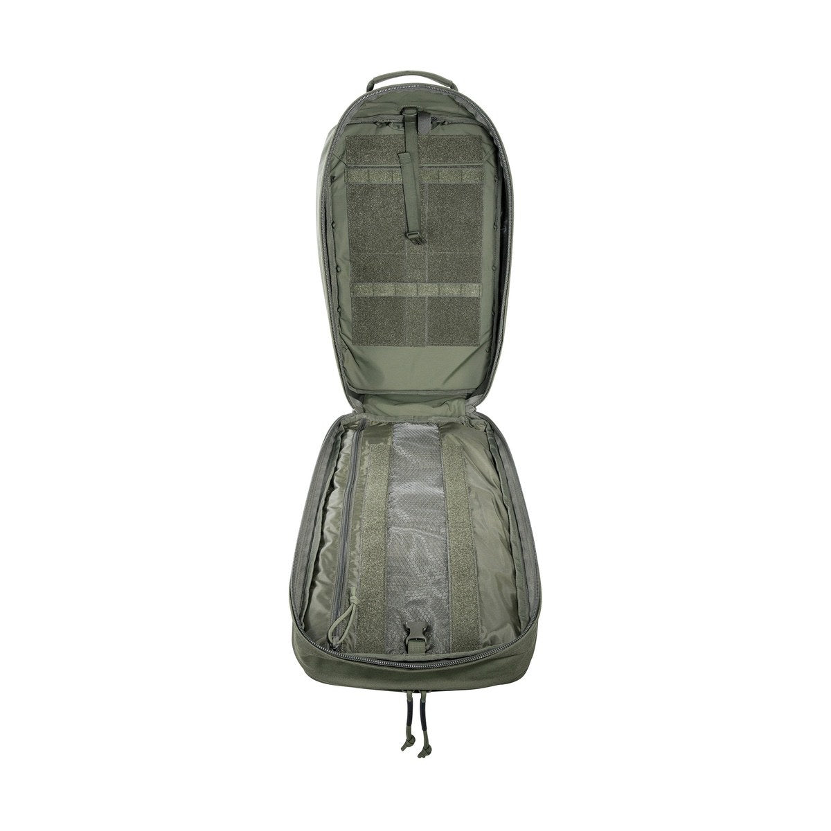 Der Grab Pack 30 verfügt über zwei komplett aufklappbare Hauptfächer, die dank umlaufender Reißverschlüsse einen uneingeschränkten Zugriff ermöglichen. Im vorderen Fach sorgen vier herausnehmbare Klett‑Innentaschen mit transparentem Deckel sowie mehrere flache Organizer-Taschen für perfekte Ordnung. Das hintere Fach bietet großflächige Klettflächen und MOLLE‑Reihen, um Module, Pouches oder individuelle Ausrüstung passgenau zu organisieren.